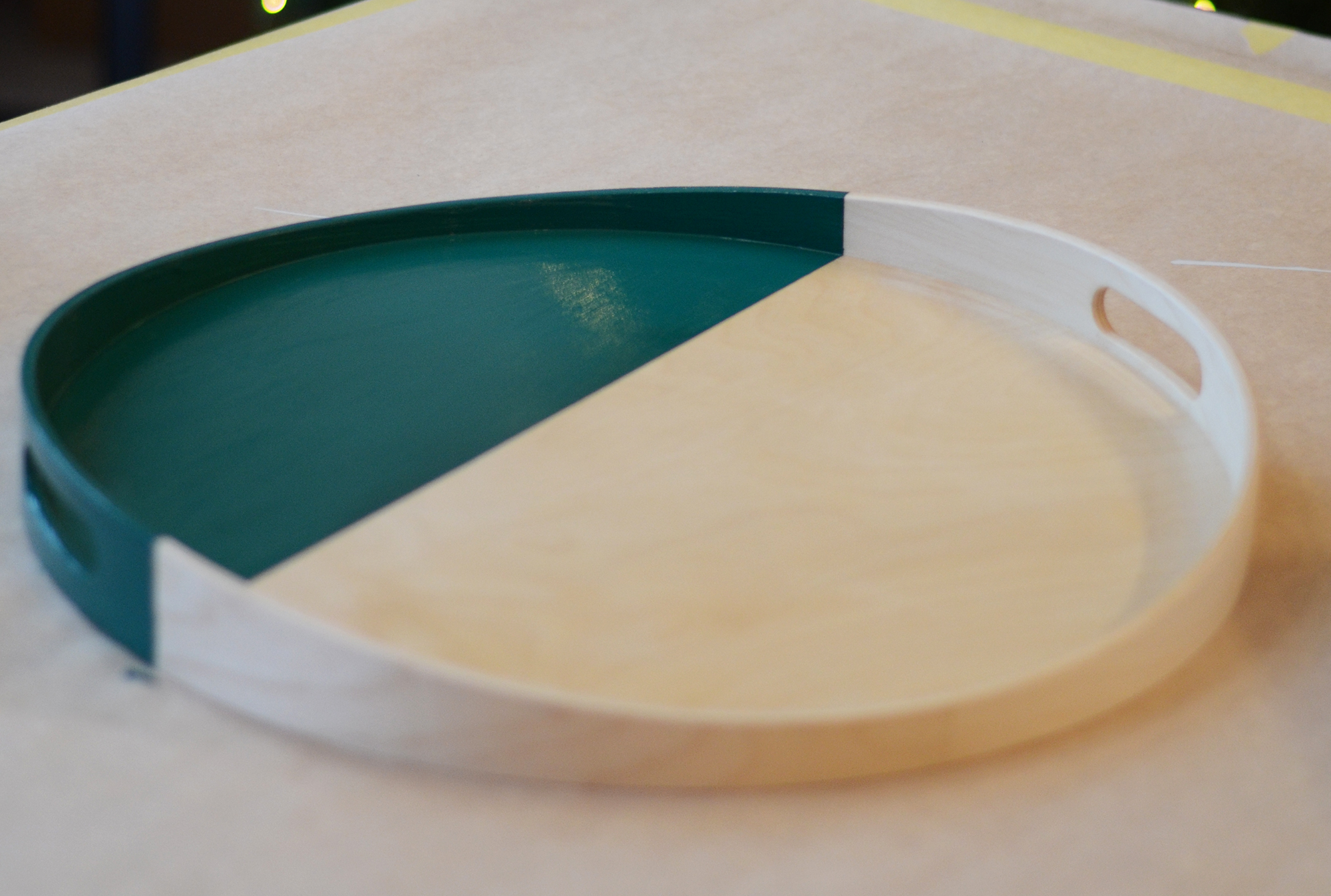 Essuyez ensuite toute la poussière de ponçage à l’aide d’un chiffon en microfibres. Utilisez du ruban de masquage pour créer le motif que vous souhaitez sur votre plateau. Votre créativité est la seule limite !